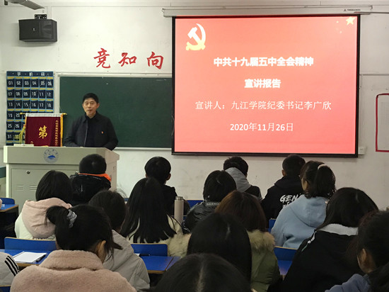 课堂上,纪委书记李广欣通过大量的事实、案例对党的十九届五中全会精神进行了深入浅出的阐述,同学们倾心聆听,大家认为这是一堂及时有收获的思政课,达到了润物无声的效果。