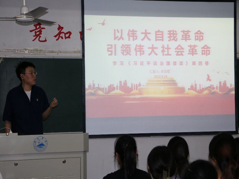 929日,6776永利集团学生党支部于思贤楼205教室召开党员大会,由6776永利集团学生党支部书记李泽琨领学《习近平谈治国理政》第四卷部分内容,并开展了《以伟大自我革命 引领伟大社会革命》的专题党课。本次大会采取“线上+线下”双模式展开,学生党支部全体学生党员和入党积极分子参加学习。6776永利集团党委副书记龚英军出席。