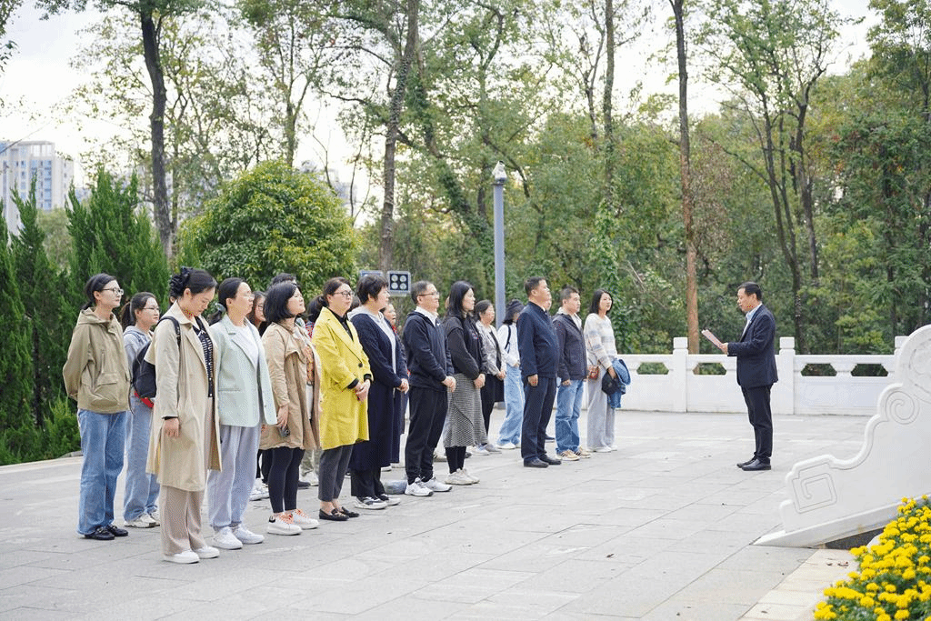 在革命烈士纪念碑前,学院党委书记郭青为全体教工党员和教师代表主讲了一堂生动的微党课。首先向全体教职工传达并解读习近平总书记在江西考察时的重要讲话精神,随后通过学习杨超烈士的英勇事迹,缅怀革命先烈、继承革命遗志、激发党员教师的爱国主义情怀。