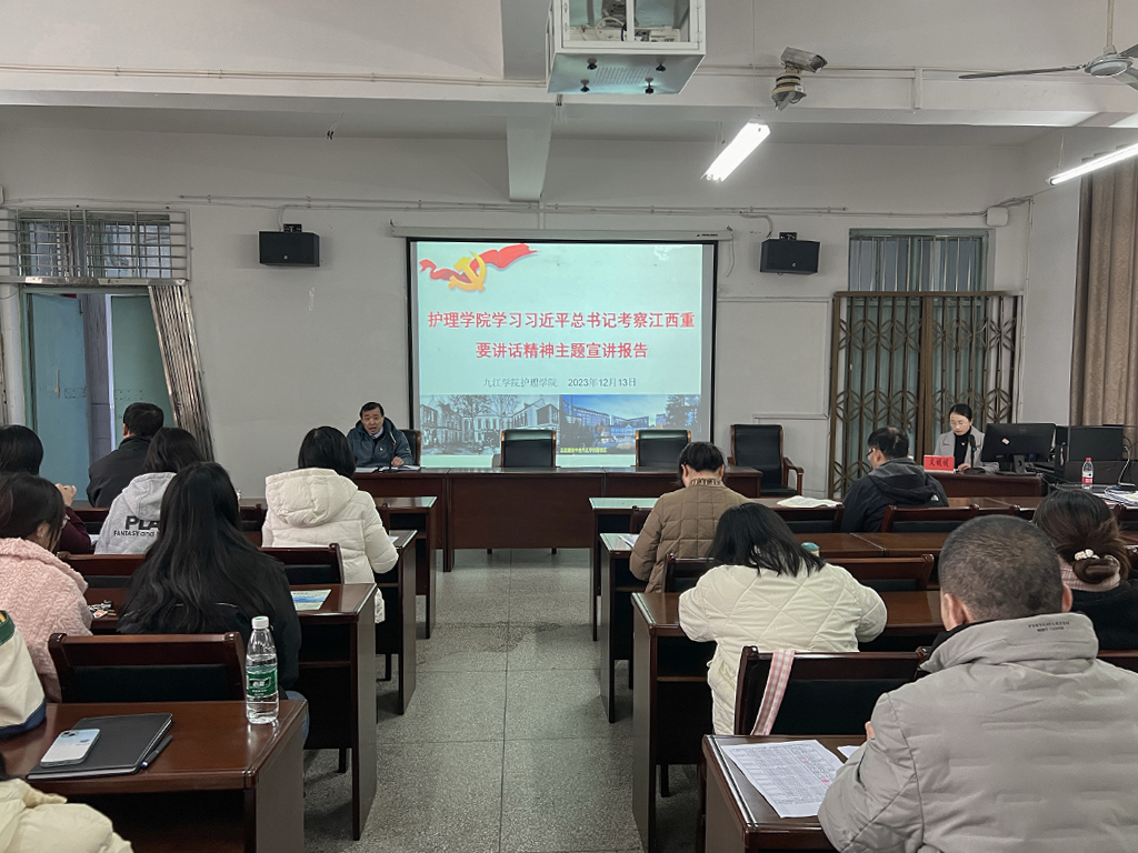 12月13日下午,护理学院在向学楼301会议室召开党委中心组(扩大)学习会,会议邀请马克思主义学院文媛媛博士宣讲习近平总书记考察江西的重要讲话精神。学院党政班子成员、科室负责人、全体党员和全院教职工、全体学生党员参加了宣讲会,宣讲会由党委书记郭青主持。