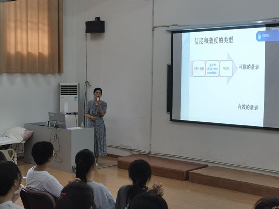 讲座中,蔡端颖分享了发展量表的步骤和量表心理学指标的测定,并以实例分享了一个优秀量表的可靠性和有效性的测量方法。通过图文并茂的课件展示,生动典型的案例讲解和通俗易懂的语言表达,为与会师生带来了一场精彩而又实用的科研试听盛宴。讲座中,全体师生专心聆听,并结合自身实际认真思考,深感受益良多。