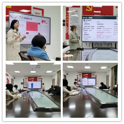 第一组倪竞老师医学心理学》课以学生为中心设计课堂,通过设计学生参加心理测试等方式激发学习兴趣,增强参与感董欣老师的《护理教育学》结合教育学、健康教育理论、护理学理论设计教学,推动经验型向实践型转变,提升教学设计的理论支撑。叶碧云老师的《护理伦理学》通过案例,强化护士职业素养,助力构建和谐医患关系,保障患者权益和提升服务质量;以推动护士从“技术执行者”向“伦理思考者”的角色转变,提升学生综合职业能力。还有廖晓春、余晓波、李缘媛三位老师分别从课程定位、教学目标、教学内容、教学方法、教学资源、课程特色、课程思政等部分进行说课,进一步优化教学设计和完善教学环节。