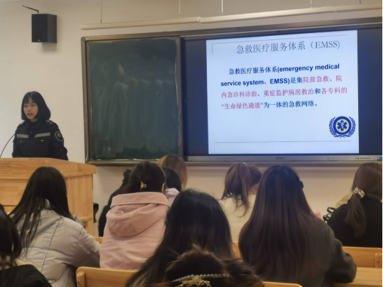 在理论授课环节,九江市医疗急救中心办公室主任柳菲老师和急救科科长张莹老师分别就EMSS系统的组成、院前急救基本原则、CPR前世今生、现场操作CPR的注意事项,以现场救援为模拟场景,分别在课堂上向同学们传授了宝贵的现场急救经验,讨论分析了一些精彩的现场急救案例,让同学“身临其境”感受现场急救的制度性、迫切性、原则性。