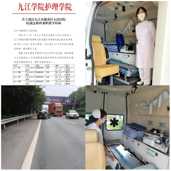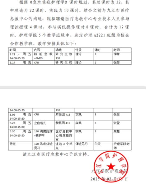 为贯彻落实学校第二次党代会确定的“3353”战略目标,高质量推动应用型专业建设,推进教育链与产业链有效融合,践行校企/行协同育人课程建设工作,2025年3月至2025年6月,《急危重症护理学》联合九江市医疗急救中心共同开展了行业引领、理论授课、实践指导、急救站体验日等一系列行业与课程协同建设活动。