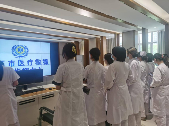 在九江市医疗急救中心调度指挥中心见习环节,熊慧科长和裴小敏主席分别带领同学感受现场120指挥调度的节奏感,领会现场调度指挥的重要性、制度、调度指挥原则,分解部分调度指挥案例;同时带领同学现场了解救护车内部结构、设备使用、出车制度。