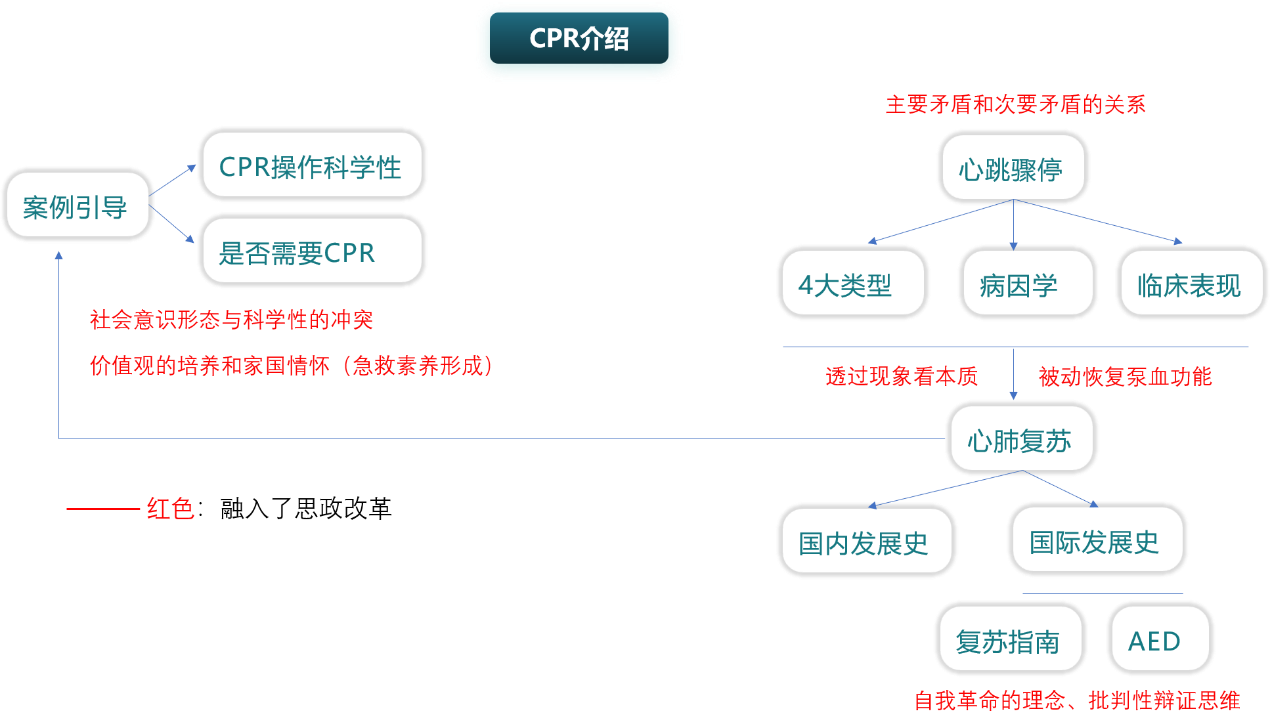 从CPR的发展演变,尤其是ABC---CAB的转变可以看出医学科技的发展是个自我革命和自我修正的过程,AHA复苏指南每5年更新一次就是为了保障所罗列的标准能够契合当下医学的发展,这符合了事务的自我革命自我修正的道理(思政改革)。