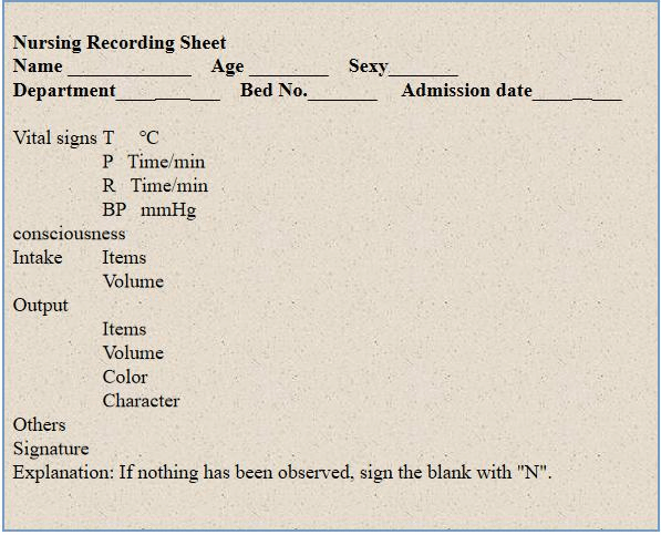 三、Continuation of the teaching content (5 minutes) Class Activities: Direction:Nursing Recording Sheet is a common activity in nursing care. As a nurse, recording information of the nursing proceed is a basic task. Please fill out the Nursing Recording Sheet according to the information below. Background: Gary Smith, 16 years old, male, was admitted into Bed 20 of the ER because of high fever, lethargy,dry cough and no appetite on July 10, 2010. T36.8℃,P68/min,R23/min ,BP12/8kPa,First, he was diagnosed as pneumonia and placed on 200ml erythromycin to dephlogisticate by Marry Smith.