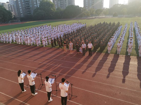 上午7时,升旗仪式正式开始。朝阳下闪耀着几抹动人的色彩:国旗红、国防绿、天使白。英姿飒爽的校团委国旗班,迈着铿锵有力的步伐,护送着国旗至升旗台。伴随着雄壮的《中华人民共和国国歌》,鲜艳的五星红旗迎着旭日冉冉升起,身着国防绿和天使白的学生方阵庄严肃立,向国旗行注目礼,伴着国歌齐声高唱,表达对祖国的热爱和崇敬,对和平的向往与坚守。