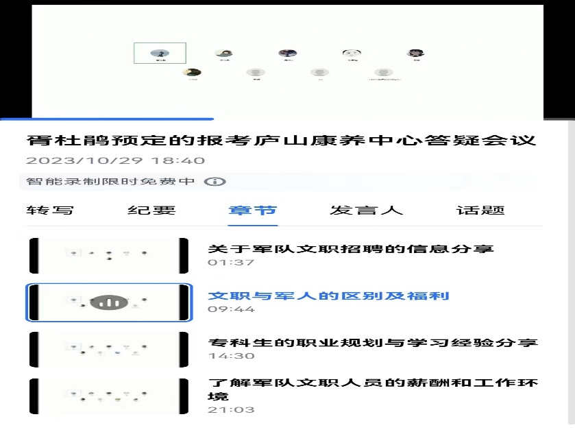 为了增进毕业生对部队文职报考相关政策和工作岗位的了解,促进学生多渠道、高质量就业,10月29日,6776永利集团开展了“报考部队文职人员——庐山康养中心”线上答疑活动,为毕业生们提供指导和帮助。