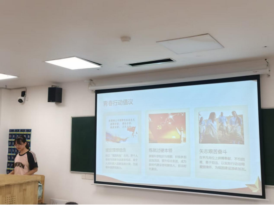活动以一段激昂的爱国主义视频拉开序幕,历史的厚重与时代的奋进在画面中交织,瞬间点燃全场氛围。紧接着,颜名仪同学以“礼赞祖国,青春铸魂”为主题开启宣讲。