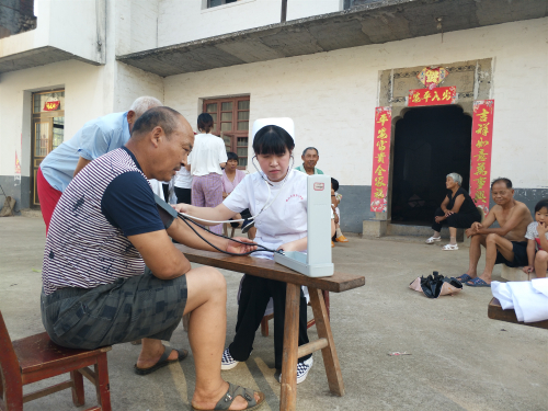 刘湾自然村,是武蛟乡上湖村第九村民小组,有几百年的历史,目前全组户数共30户,总人口135人。由于村中多数青壮年外出打工,家中只剩老年人,刘家湾成为了名副其实的“老人村”。清晨,刘梦玲老师带领志愿者们来到当地独居老人家中,为他们送去日常生活用品和米面等,并为其量血压和进行简单的健康评估,让老人感受到了久违的暖暖温情。接着,志愿者们来到村里老人聚集较多的地方,为他们测量血压以及宣传一些基本的健康常识。热情的老人还为志愿者们表演太极、舞剑,现场氛围十分和谐。
