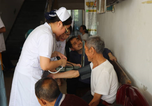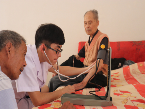 义诊队伍和健康宣教队伍,在上湖村福寿居养老院扎点,同学们热情为老人们测量血压、脉搏等,为每位老人准备健康档案。同时宣讲关于高血压、糖尿病的知识,在同学们的努力下在场氛围一片和谐。