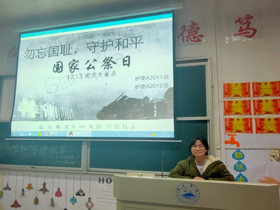活动伊始,各班团支书播放南京大屠杀相关历史视频,视频中南京大屠杀幸存者讲述当时法西斯的残忍与无情,全场肃静,同学们都静静聆听着受难者内心对和平的向往之言。随后,同学们观看南京大屠杀相关图片及历史资料,进一步加深了同学们对国家公祭日和南京大屠杀的理解。最后主持人为大家讲解了国家公祭日和南京大屠杀起源时间与意义,整个活动过程中,全场庄严肃穆,气氛凝重,同学们纷纷表示要铭记历史,勿忘国耻,立志成才,报效国家。