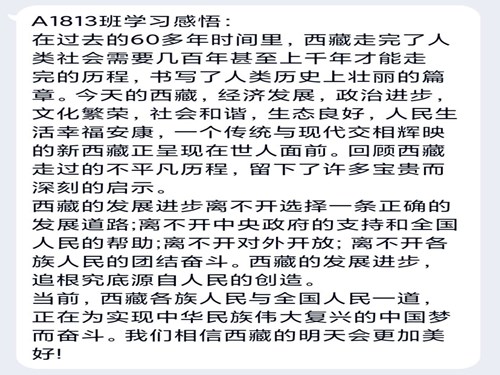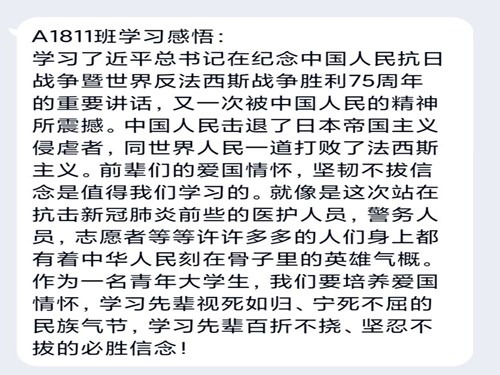 九月十八日晚,6776永利集团开展线上思想政治学习活动,6776永利集团全体学生积极参与。同学们分别学习了习近平总书记在纪念中国人民抗日战争暨世界反法西斯战争胜利75周年座谈会上的重要讲话、习近平在中央第七次西藏工作座谈会上的讲话精神及《习近平谈治国理政》第三卷。同学们自觉参与学习,并纷纷发表自己的感想:“中国是用先辈们的血肉铸就的,伟大抗战精神,是中国人民弥足珍贵的精神财富,我们要铭记历史,振兴中华,为建设更美好的新中国贡献自己的力量。”同学们彼此交流感想,对此次学习内容有了更深一步的认识,也对新中国的成立之艰辛与建设之不易有了更深切的体会。