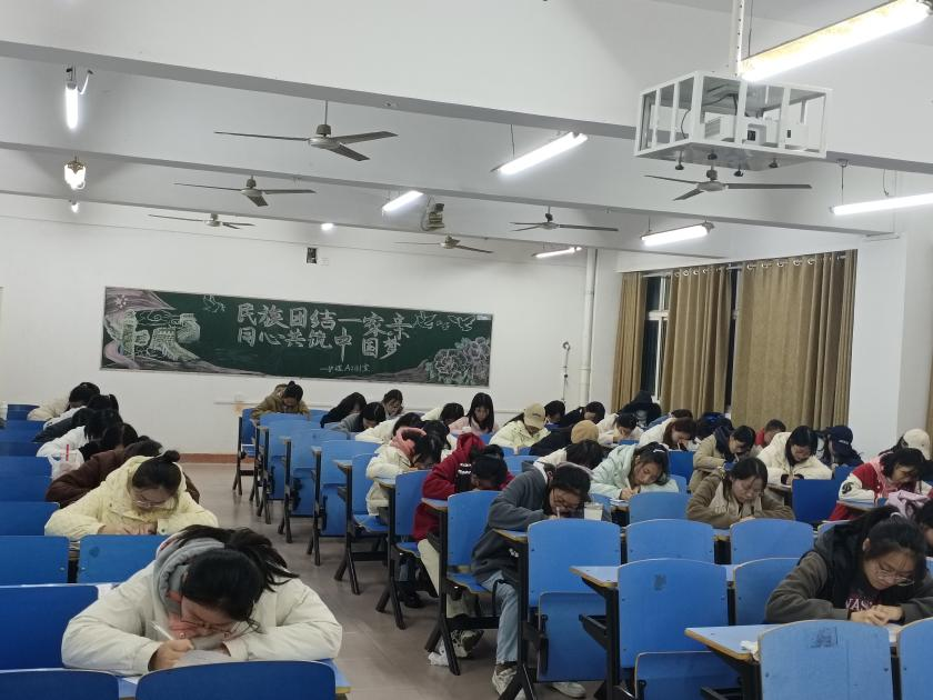 比赛采用线下答疑形式,通过笔试和抢答两种方式决出优胜者。试卷铺展,题目形式多样,其中包括汉语听写、诗词填空、飞花令等经典题目。同学们沉着冷静,下笔有神、含英咀华,充分展示了良好的人文修养和综合素质。参赛人员精神饱满,锐气昂扬。随着笔尖的滑动,比赛落下帷幕,甘蒙、乐思源同学摘得桂冠,刘小林、刘莼皓、陈铭慧同学获得二等奖,李小玲、洪俊彤、孟芷平同学获得三等奖。