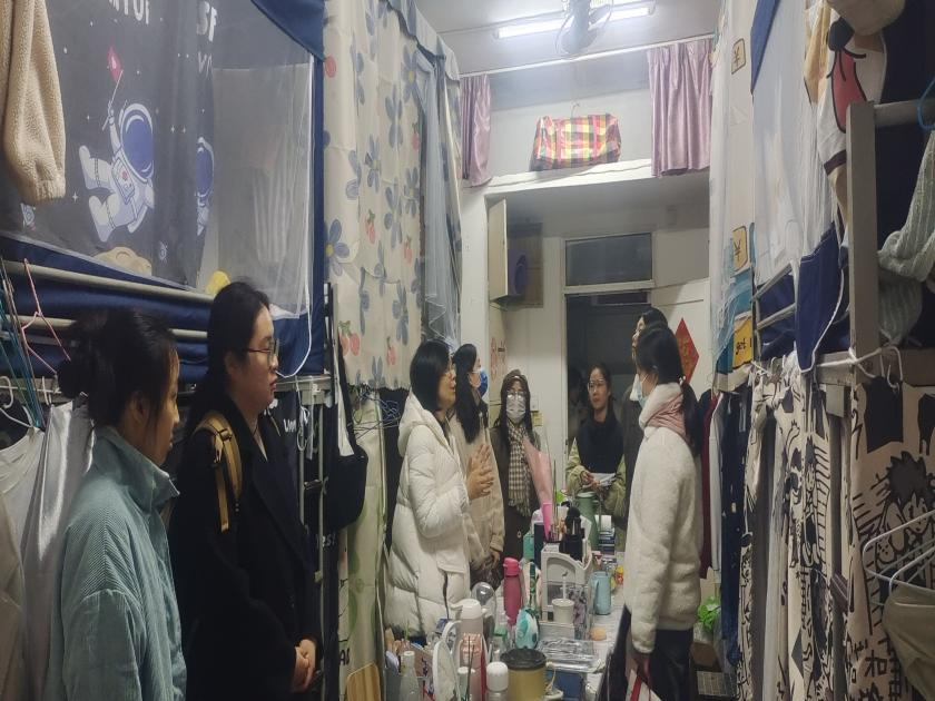 初审后,所有辅导员检查寝室文化节的开展情况,进行复审。他们深入到每一间宿舍,重点询问新生的入住状况,关心他们的生活点滴,加强新生的归属感,听取学生的想法和意见,鼓励同学们尽快适应校园生活;每到一间宿舍都着重强调要正确用电、安全用电、严格防范诈骗等安全问题。走访看望的同时,为保障学生校园生活的安全。老师们对宿舍门禁安全、学生寝室环境等进行仔细的了解,既让同学们感受到了人文关怀,又对安全工作提出了更高的要求。