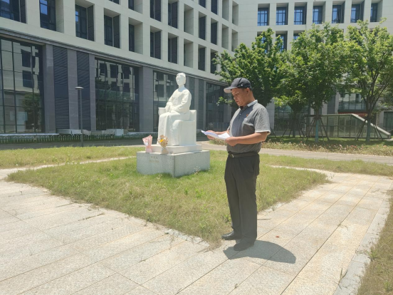 在雕像前,党委副书记龚英军以石美玉精神为切入点,为全体党员、预备党员和入党积极分子带来一堂深刻党课。他结合新时代护理事业发展需求,号召大家以先辈为镜,锤炼专业技能,涵养仁爱之心,在服务人民健康中实现人生价值。