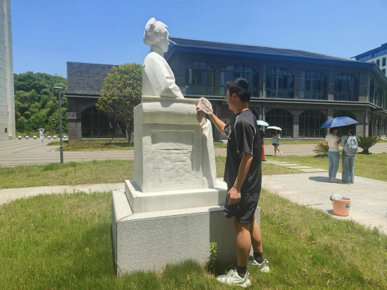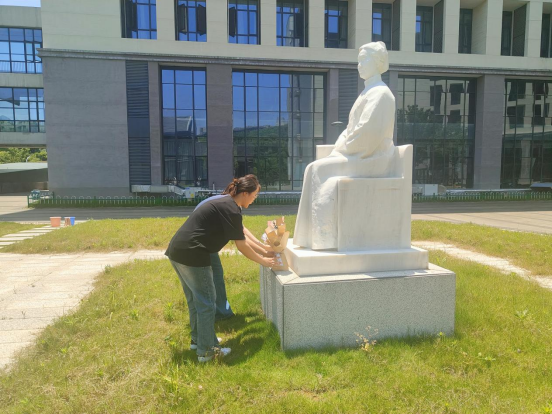 活动在肃穆的氛围中拉开帷幕。同学们手持清扫工具,细致擦拭石美玉女士石像,拂去的不仅是雕像表面的尘土,更是对先辈敬意的具象化表达。随后,党员代表缓步上前,将鲜花轻轻献于石像基座,绽放的花朵象征着护理精神的薪火相传。