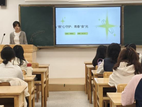 会议伊始,主讲人通过精心制作的演示文稿,结合国家统计局公布的粮食安全数据,围绕“粮食安全的国家意义”“校园饮食浪费典型行为”以及“光盘行动的实践方法”三个方面展开深入讲解。随后引入教育部相关倡议,并以“每节约1公斤粮食,可减少3.6公斤碳排放”的具体数据,有力打破了“剩饭少量无关紧要”“多打菜显大方”等认知误区,在同学们心中树立了节约粮食的价值认同和社会责任。现场同学们反响热烈,一致承诺将把“光盘行动”落到实处,让节约成为校园新风尚。